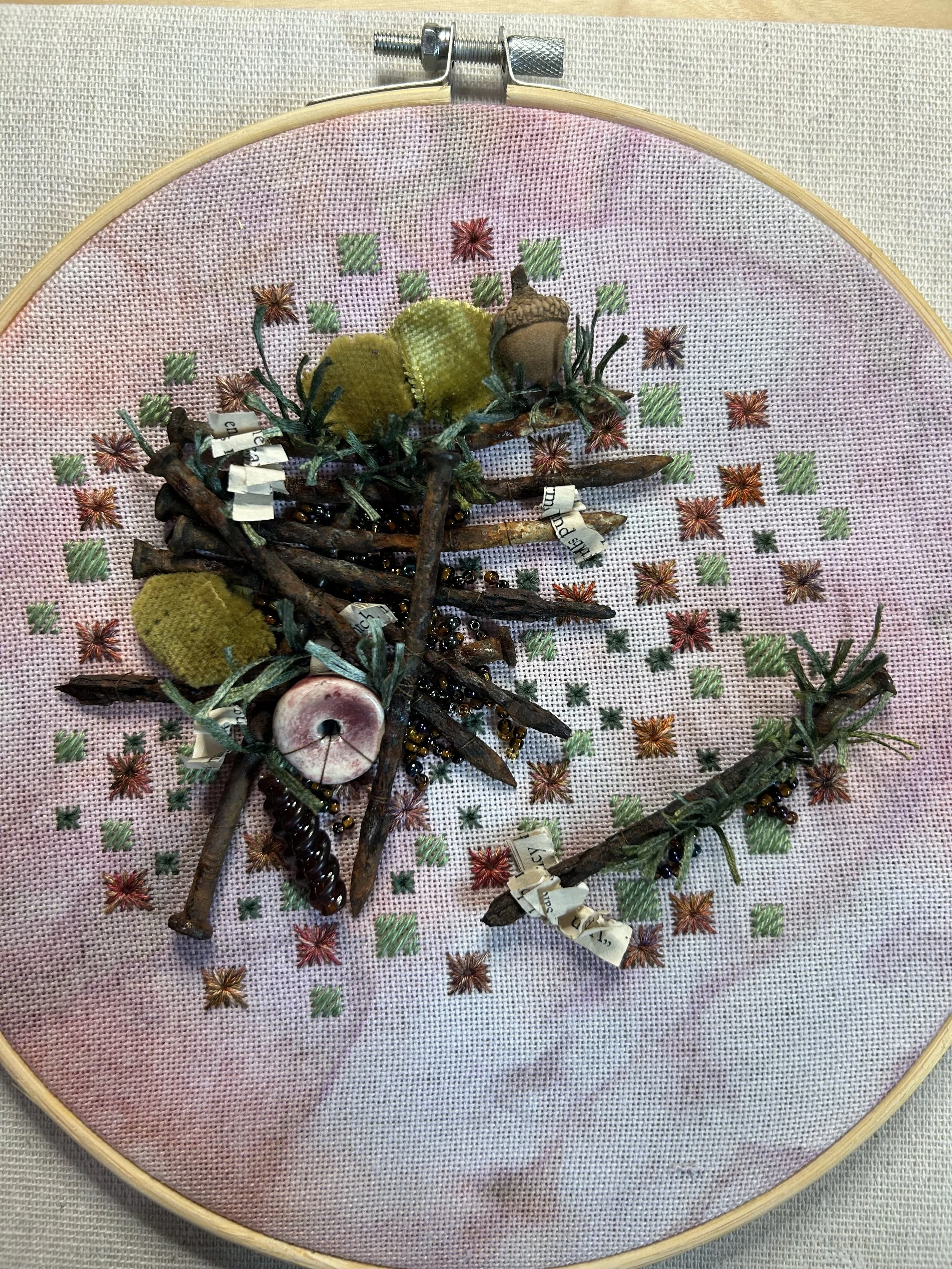 Today I had a lovely finish on a project I am very proud of. It’s stitched with rusty nails I found on my deck after it was reconstructed once the plumbing issue was dealt with.
